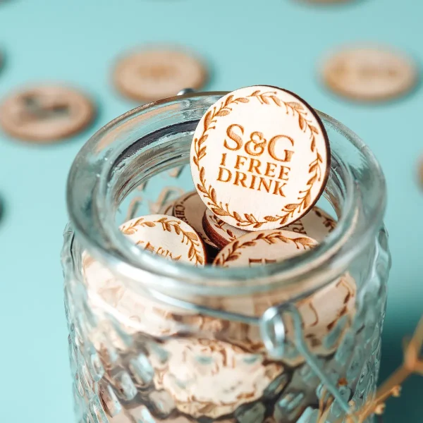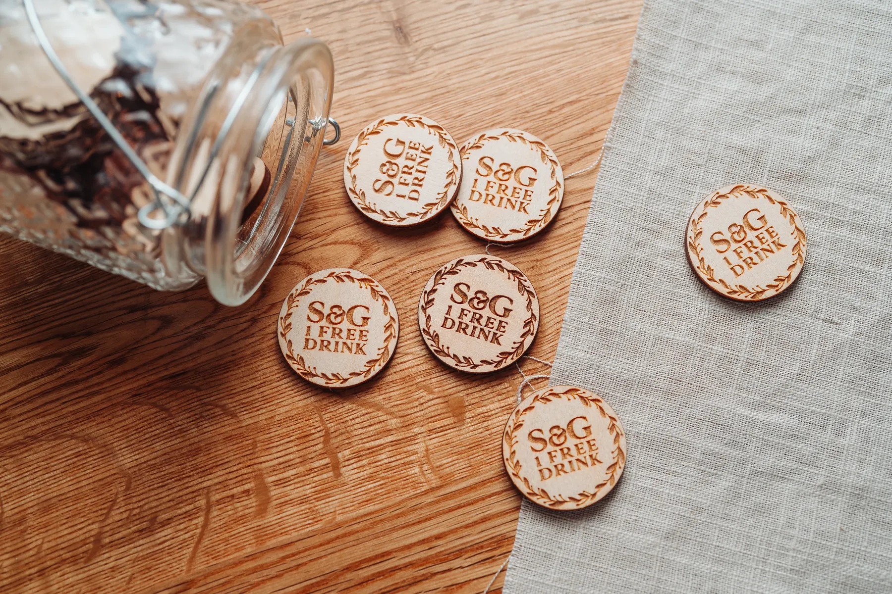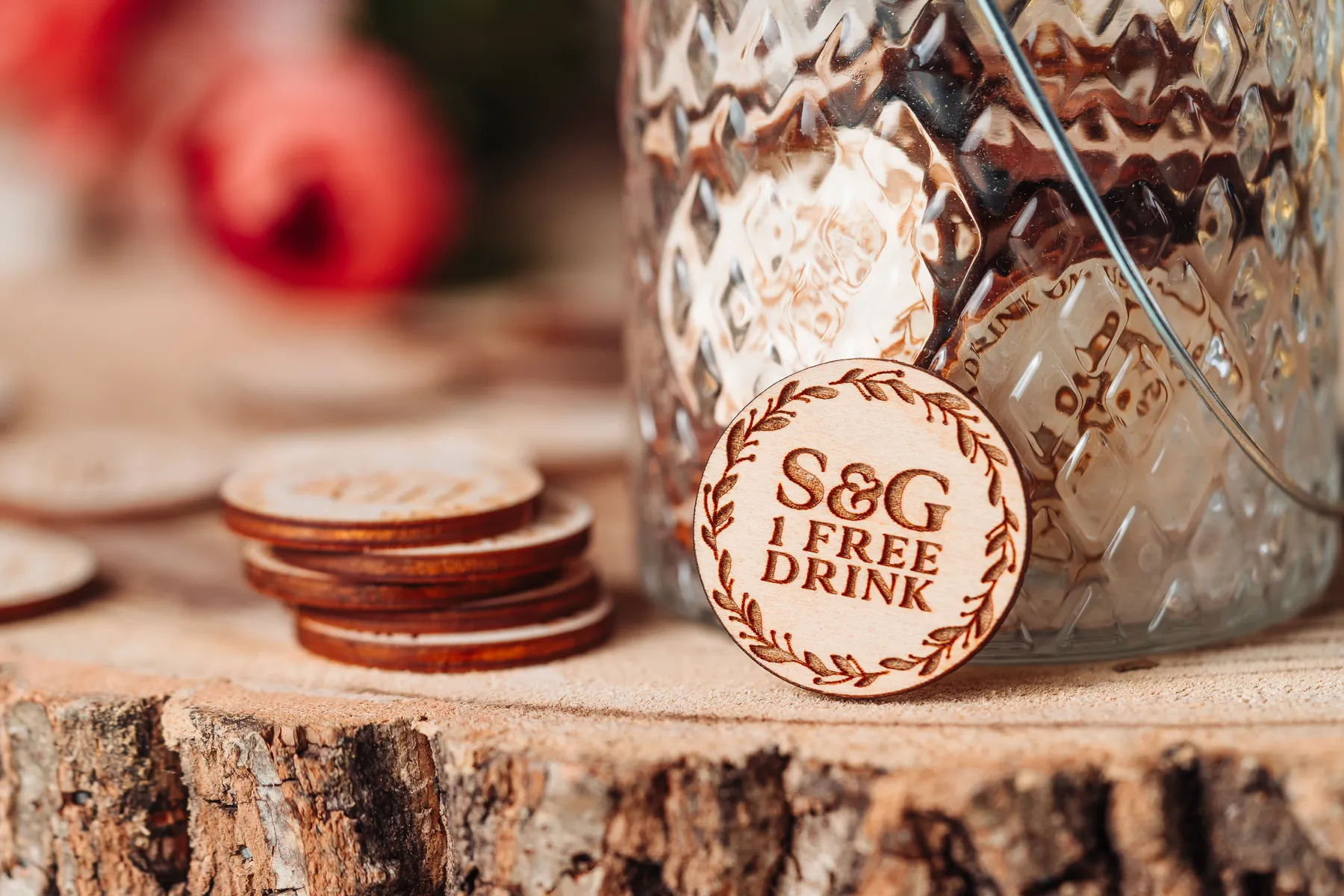 Each token features a gorgeous rustic wreath emblem, your initials, with the phrase ‘1 free drink’ carefully engraved around the edge. These tokens are a unique and thoughtful wedding favor that will make your wedding reception even more memorable. Totally customisable for food, drink or happy hour!