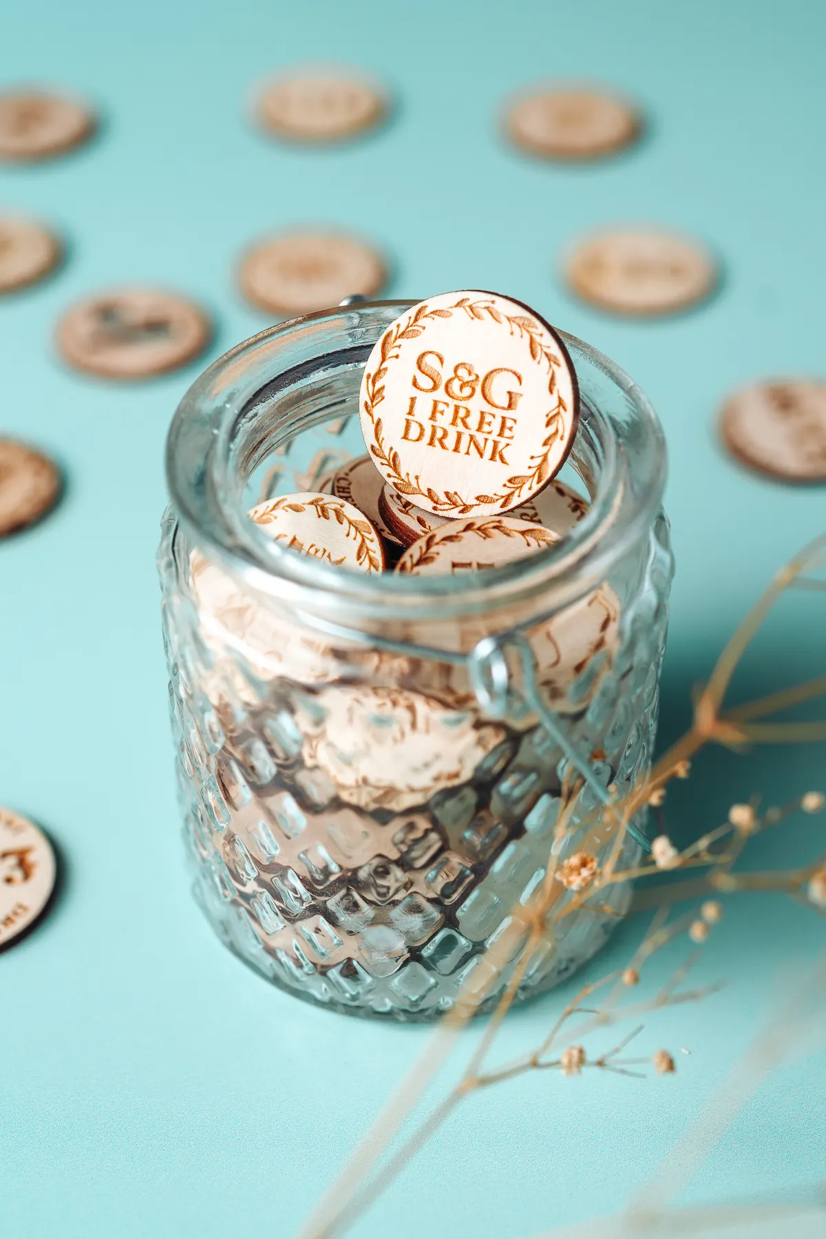 Our wedding drinks tokens are perfect for use at the wedding bar or food outlet, and they also make a great addition to your wedding decor.
