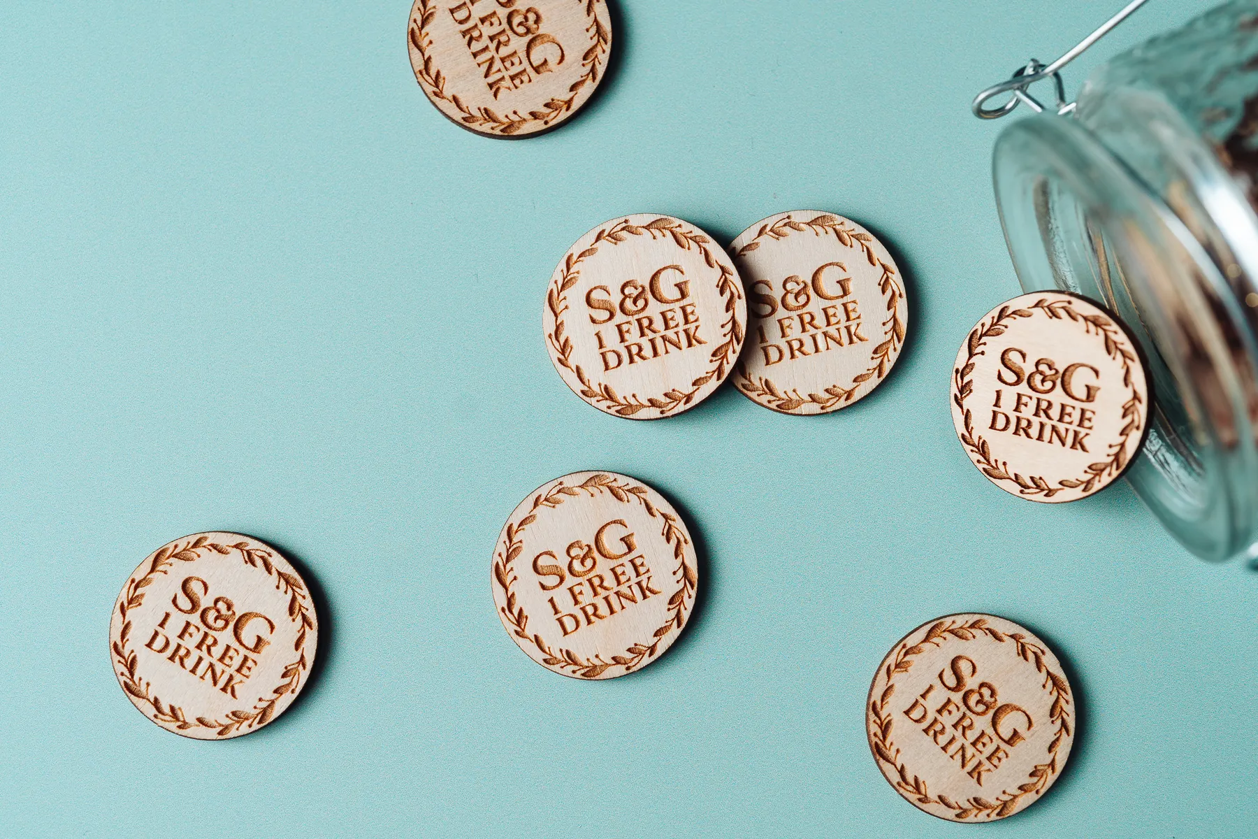Make your wedding day even more special with our personalised wedding drinks token. These tokens (sometimes known as Bar Chips) are a perfect way to thank your guests for celebrating your special day with you.
