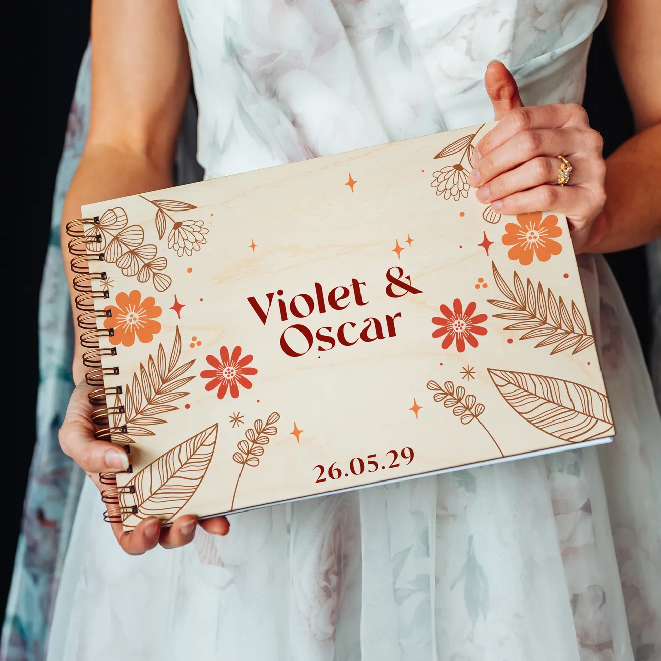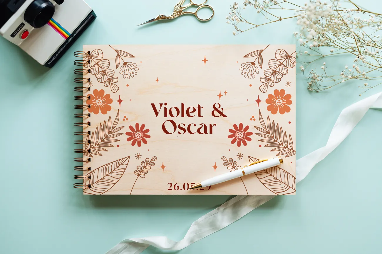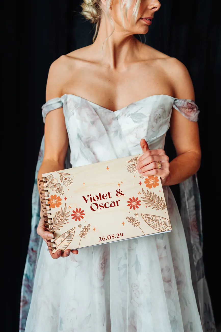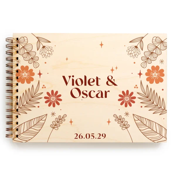 Finished with a natural birch wood cover and decorated with hand-drawn botanical illustrations in rich terracotta, rust, and warm orange tones, this guest book was made for couples who love the beauty of the earthy, the organic, and the effortlessly romantic. Your names and wedding date are printed directly onto the wooden cover, giving it a bespoke, artisan quality you simply won’t find on the high street.