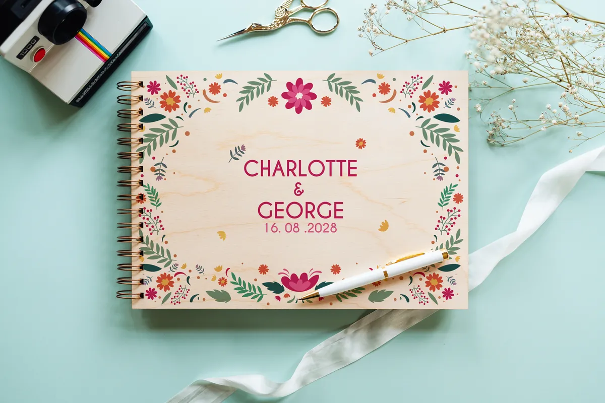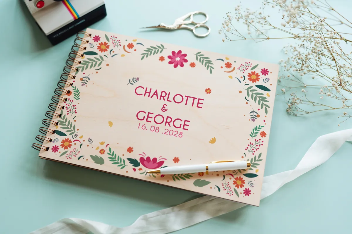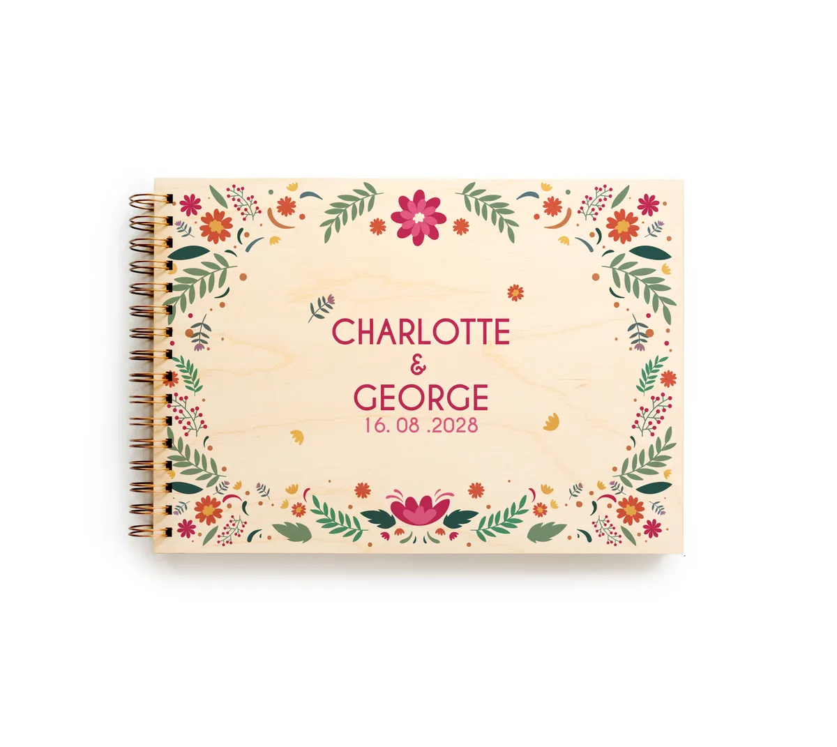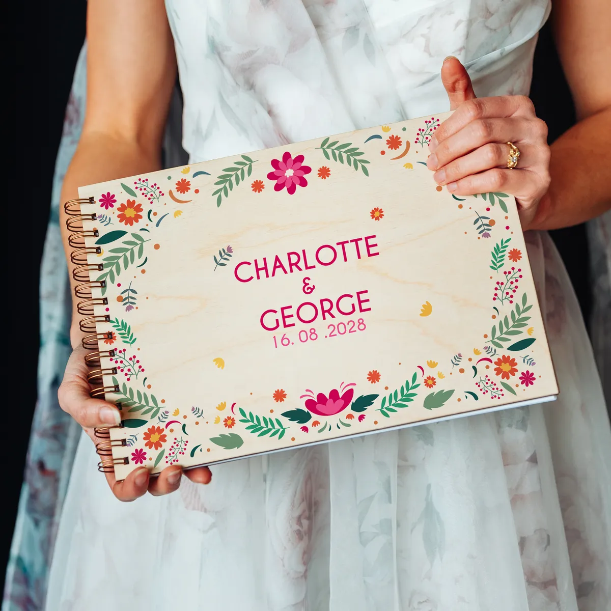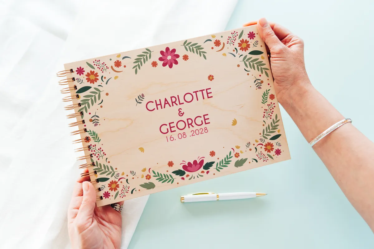 Your custom names and wedding date are printed in a bold, elegant centrepiece font, framed by the stunning floral border, creating a guest book that doubles as a table display piece on your big day and a treasured keepsake for years to come.
