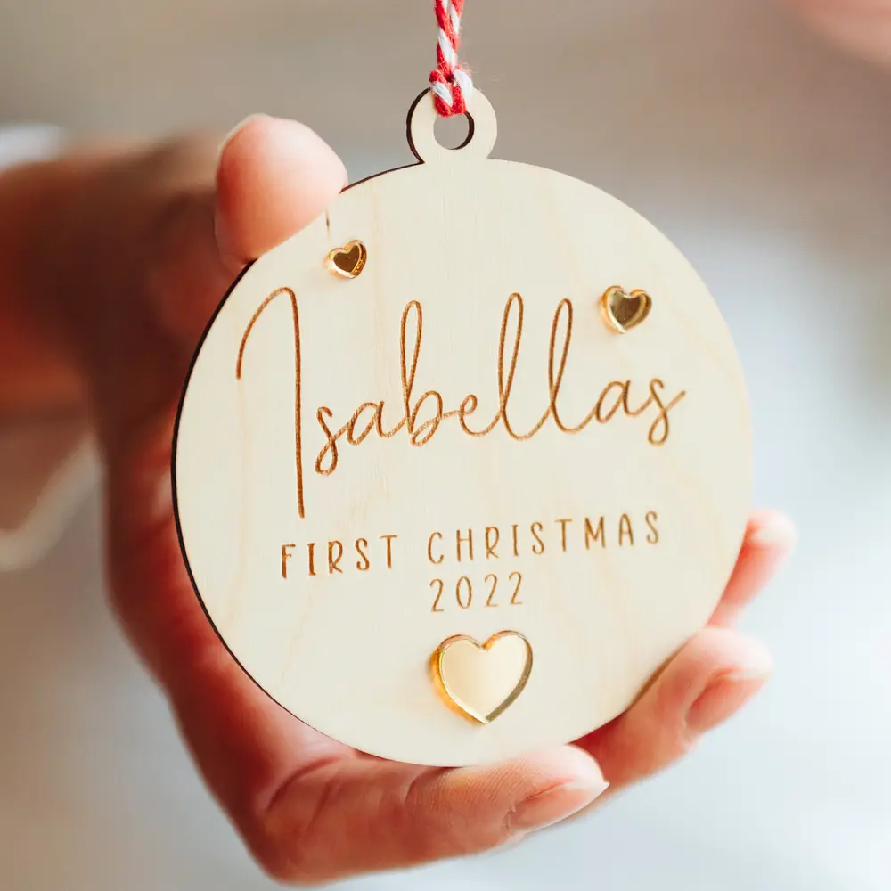 Each wooden new baby bauble is personalised with the name of your choice and surrounded by gold hearts.