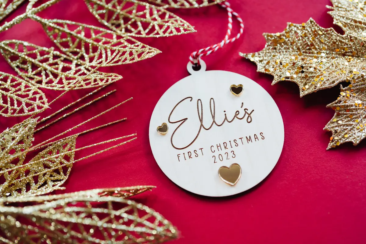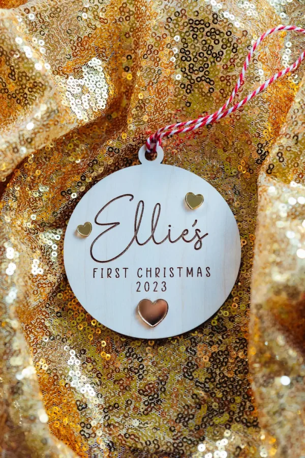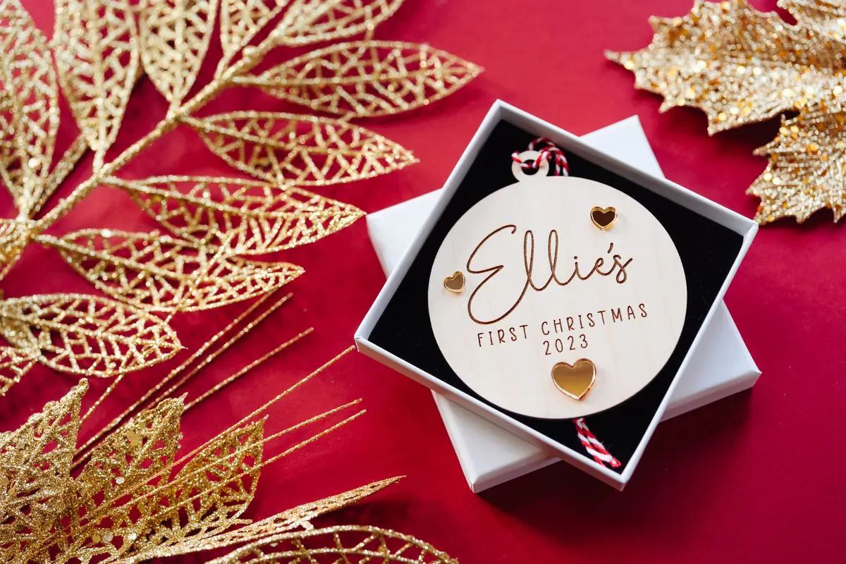 Childs First Christmas Bauble – encrusted with gold hearts. The perfect celebration of a newborn’s First Christmas. The perfect and personal baby gift! This will read 2024