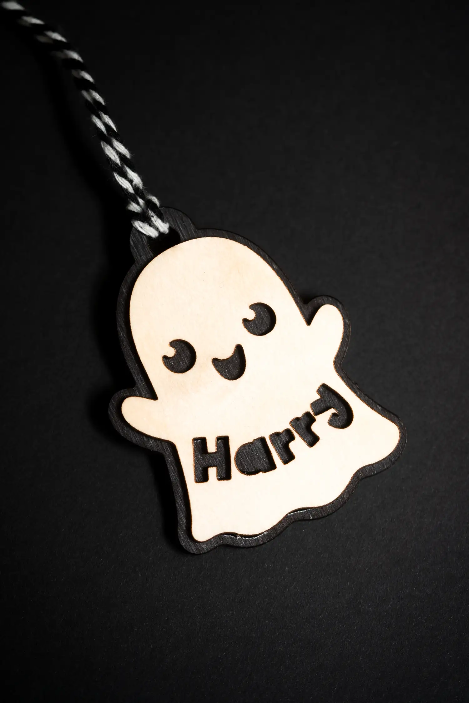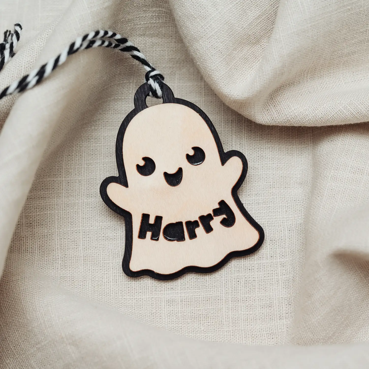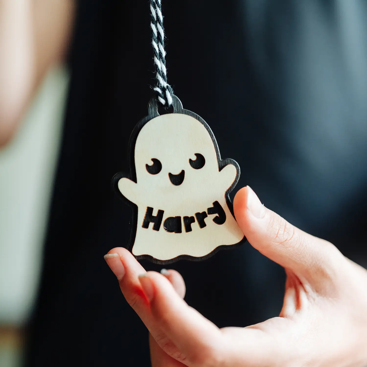 Each skeleton name tag is customised with a child’s name, making it truly special. Engraved in wood and supplied with black and White string (very scary!)
