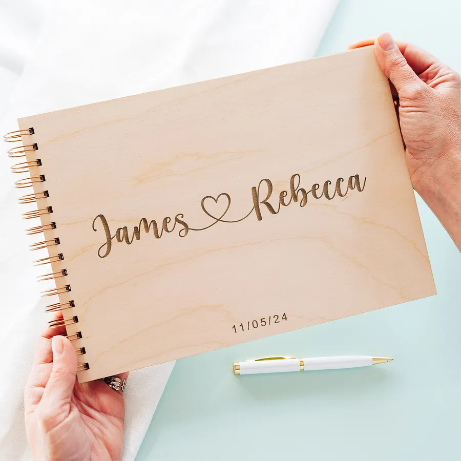 Engraved in wood and using high-quality thick, bright white paper, our books are ideal not just for good wishes but also photos. The perfect contemporary guestbook or Photo Guestbook.