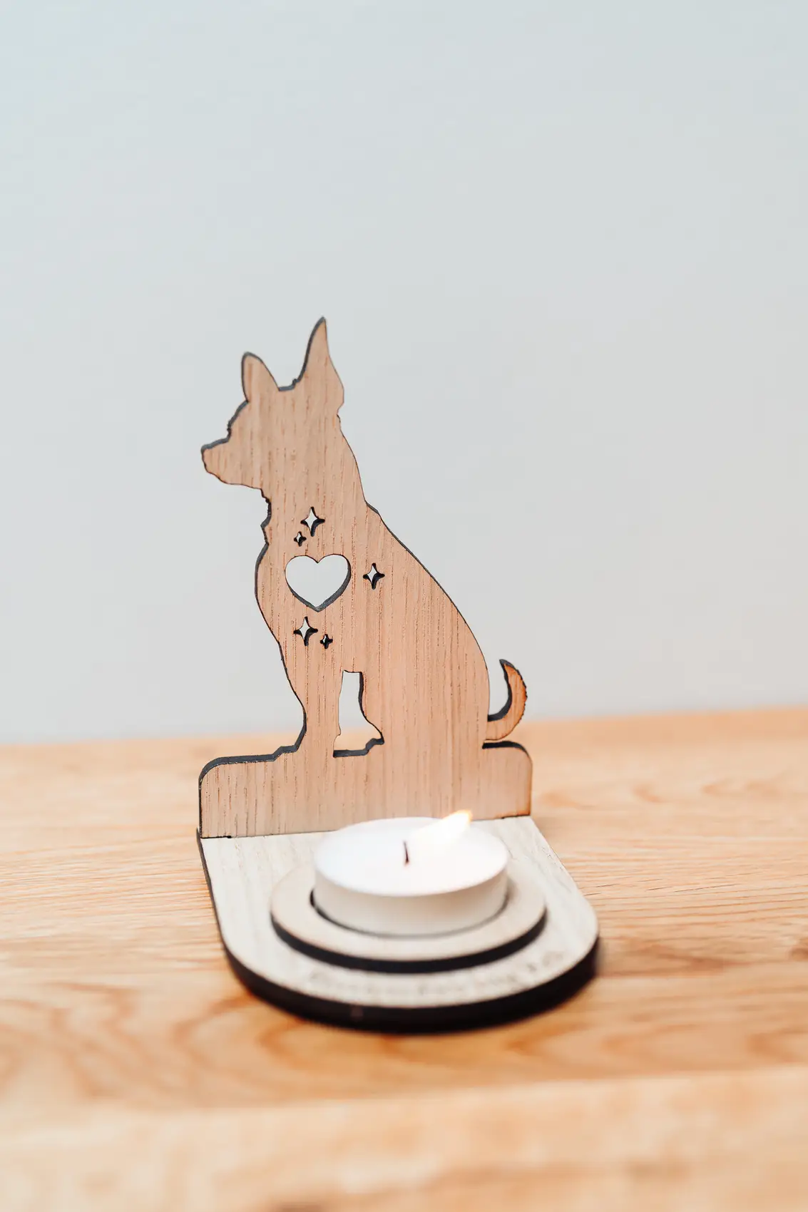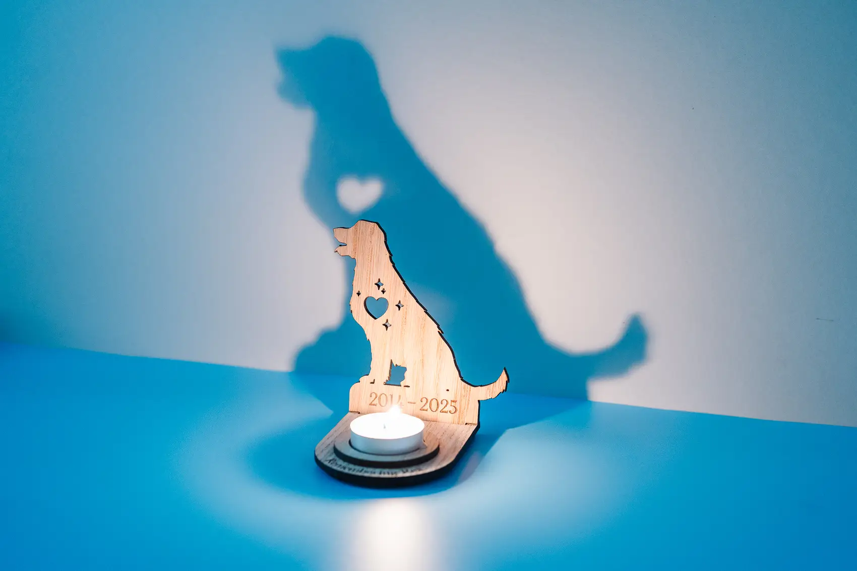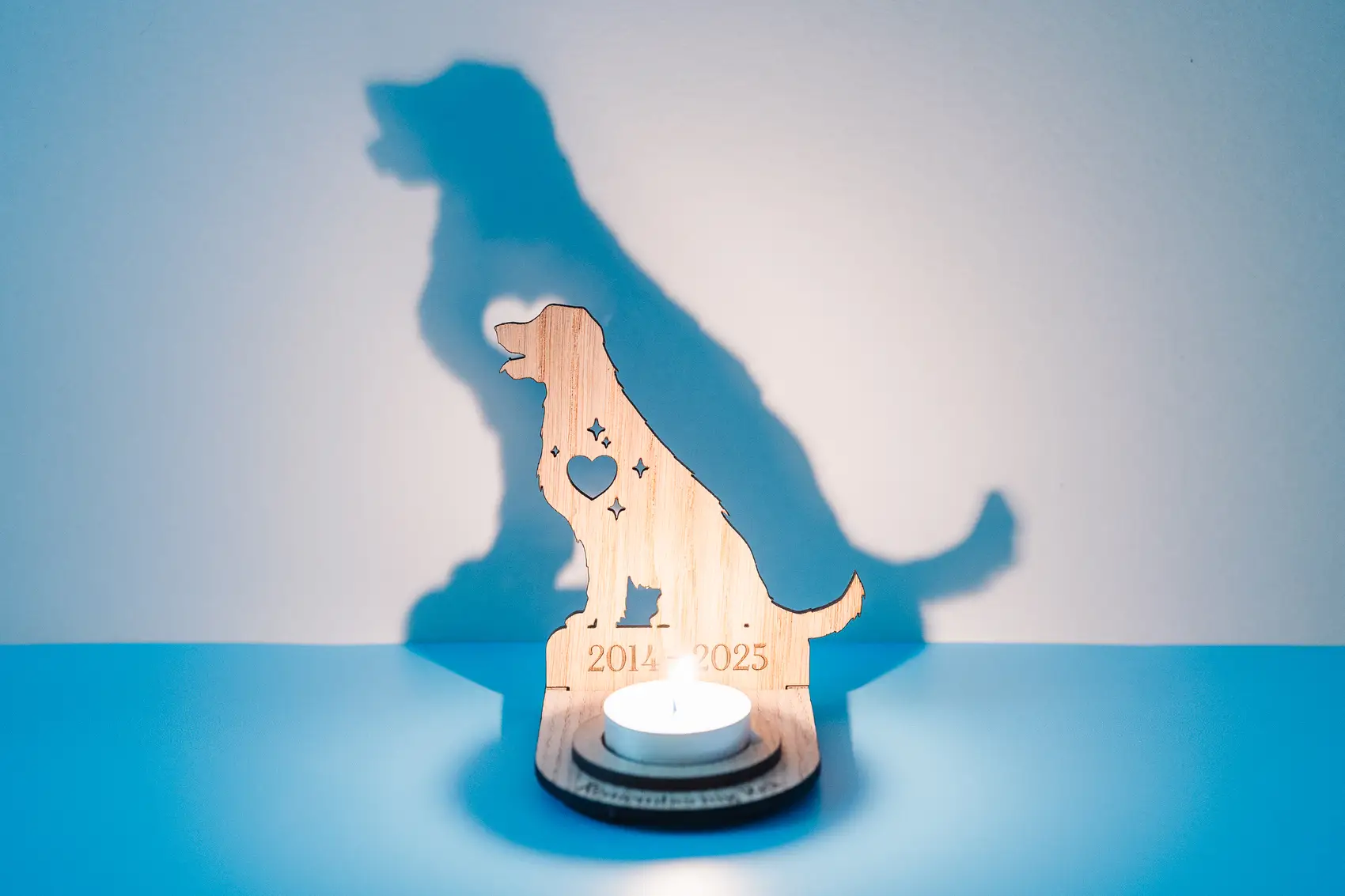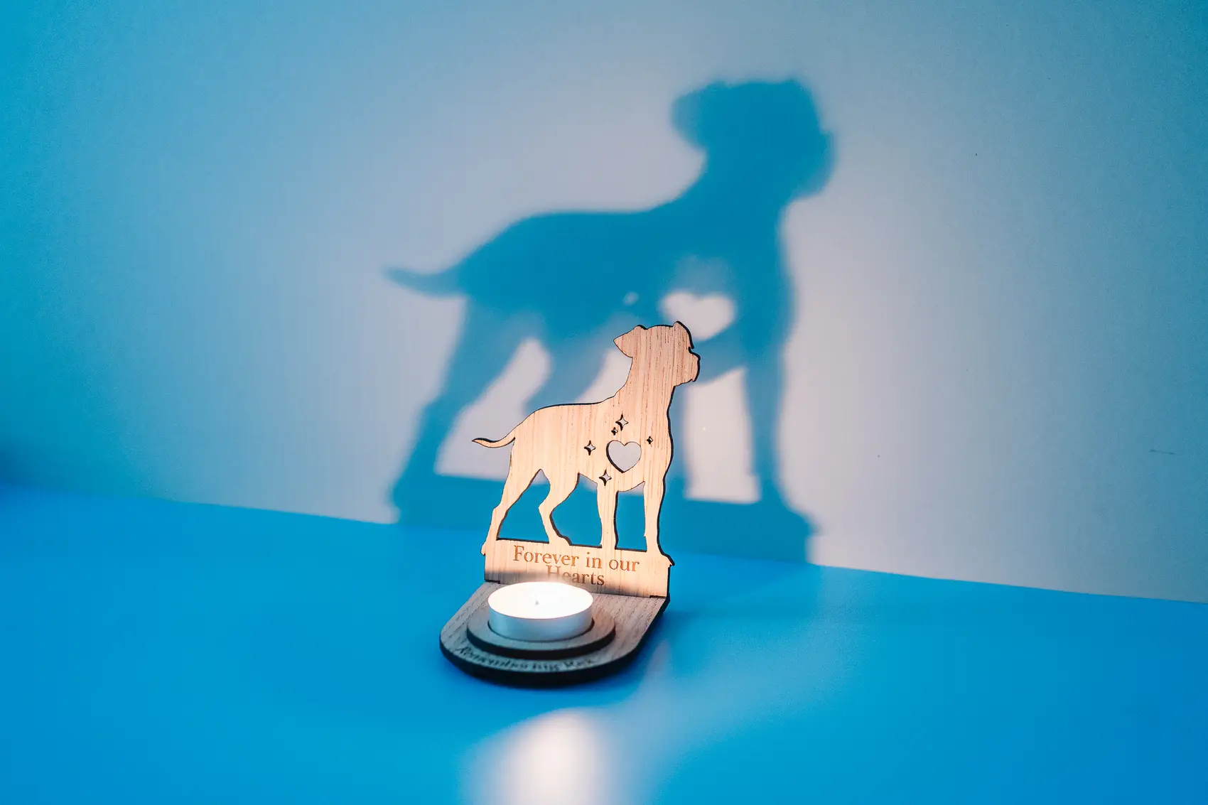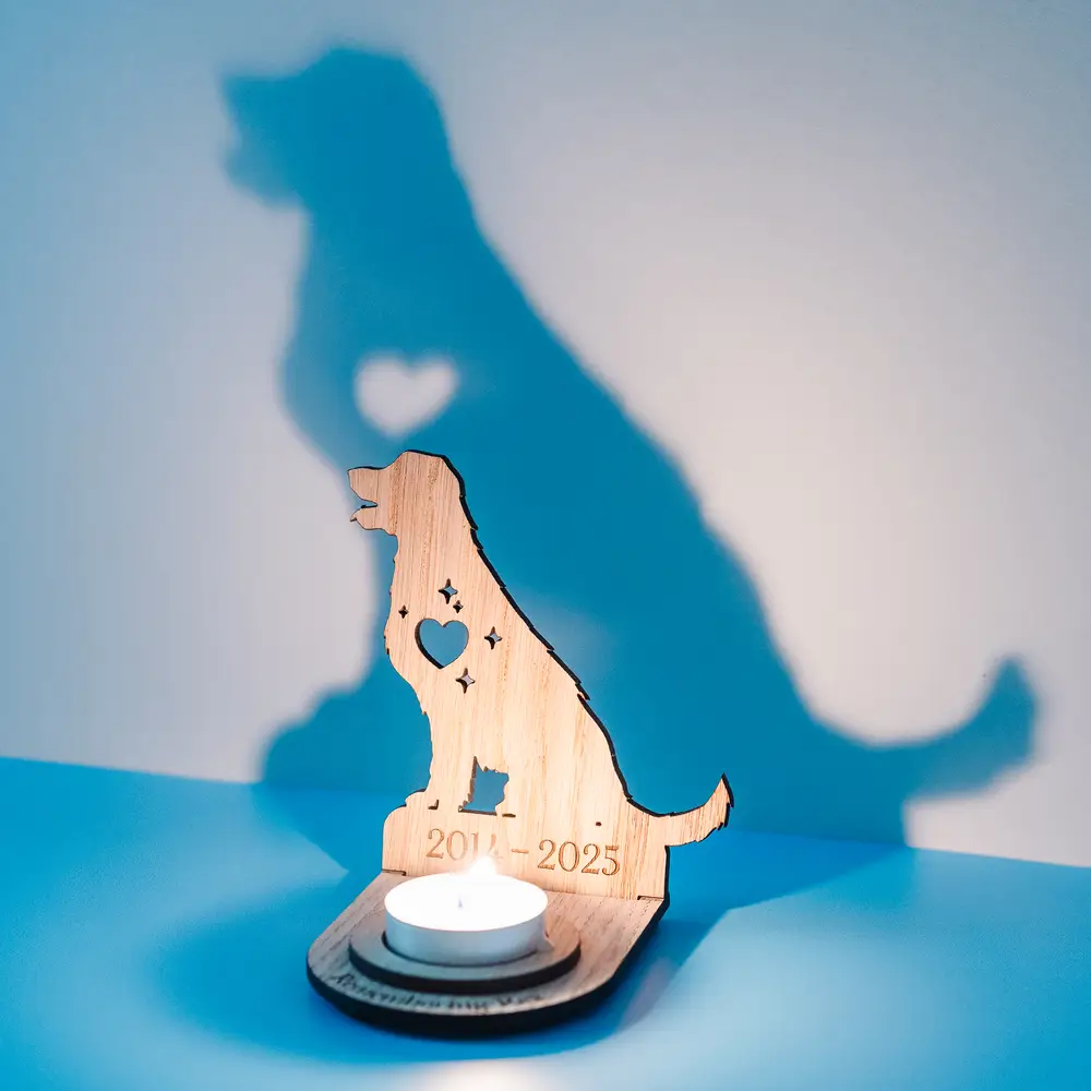 Our memorial pet stands can be personalised in a number of ways. A name can be added to the front of the stand (around the candle) with a date on the silhouette. And when lit (if it’s dark enough) the silhouette will project the shape of your pet on a wall behind the stand.