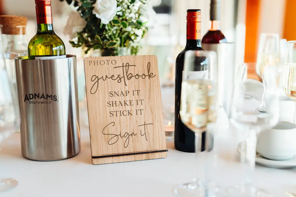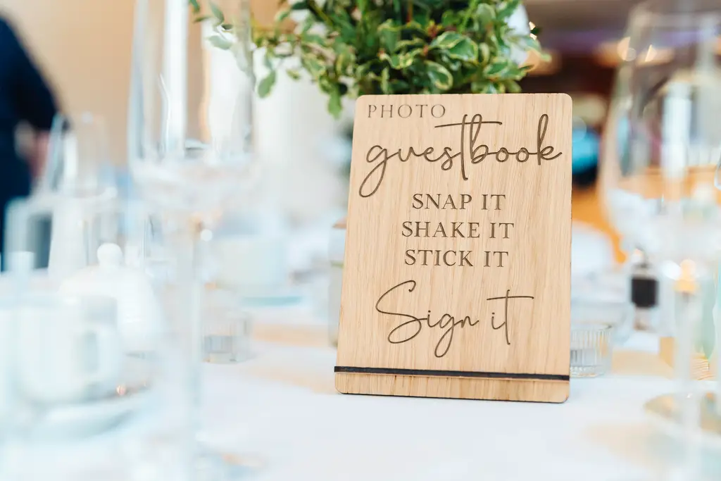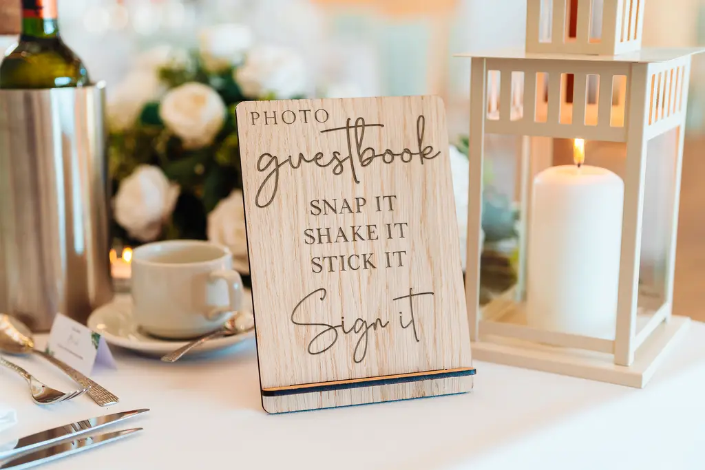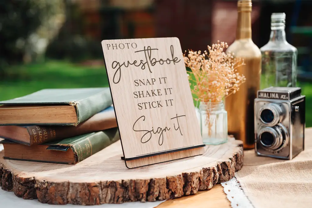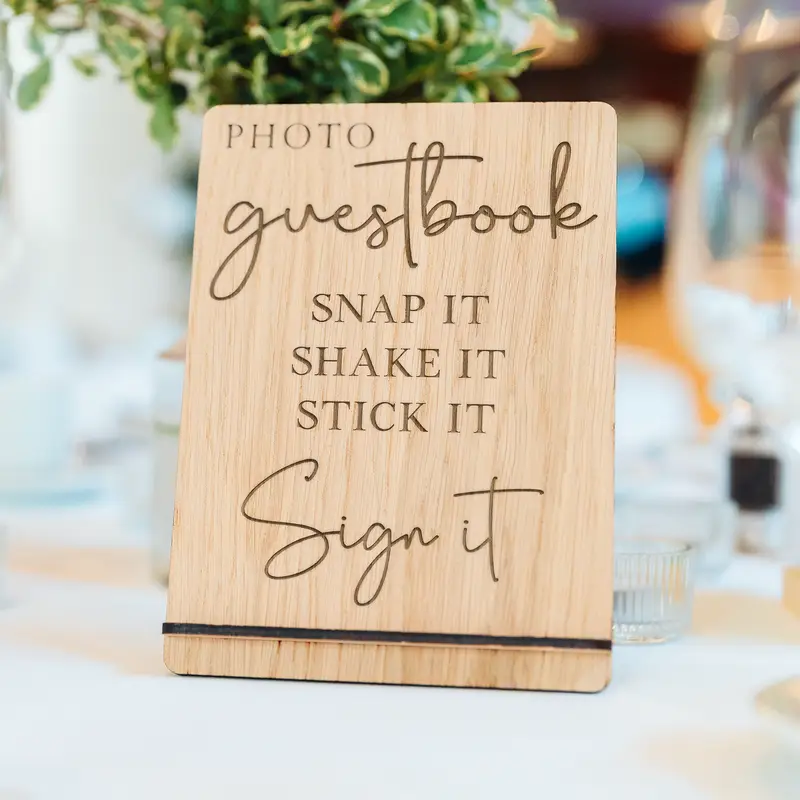 Snap It Shake It Stick It Sign It Wooden Photo Guestbook Wedding Sign. Made from Oak veneer this sign has a rustic yet classic look and feel.