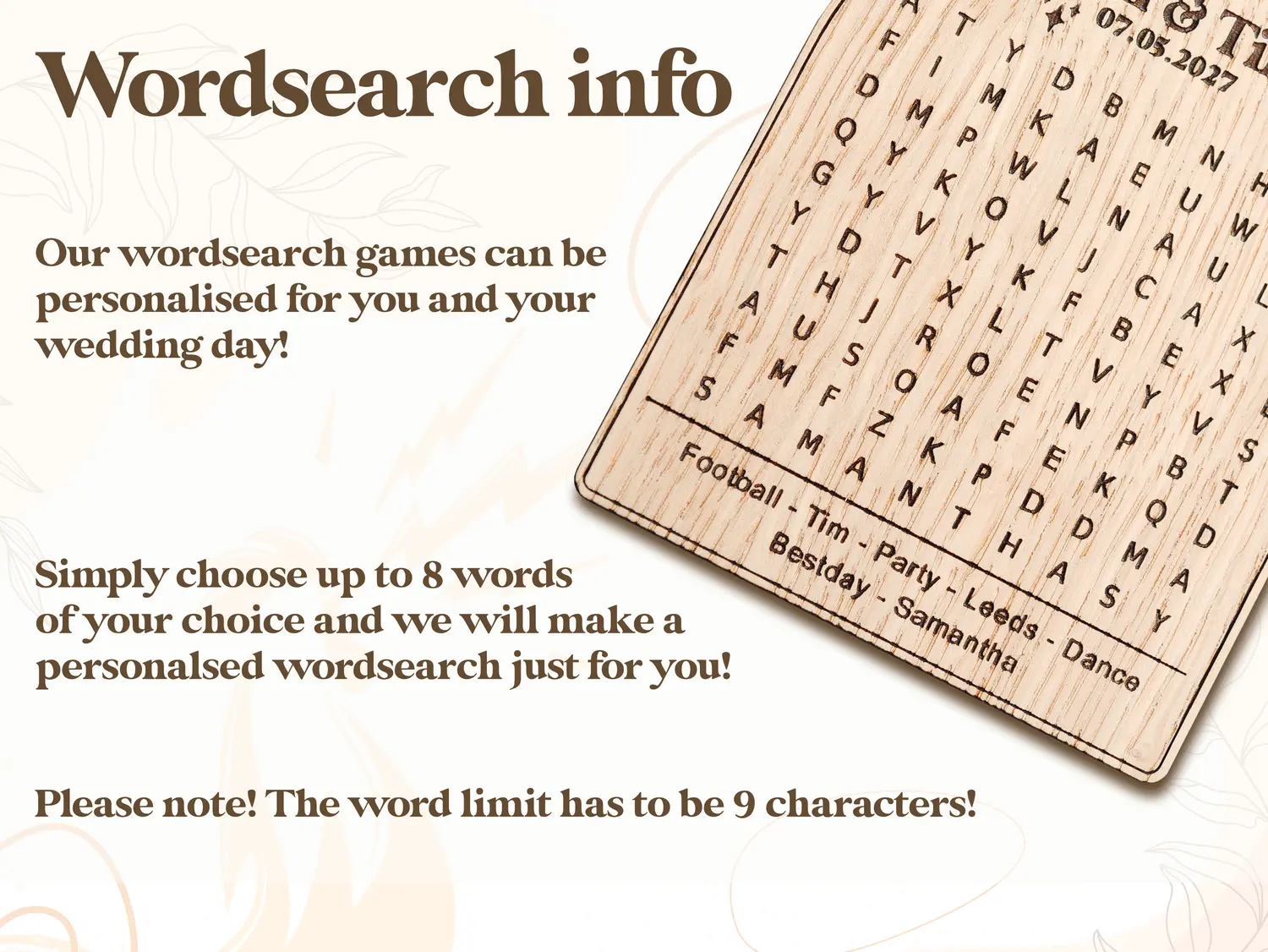 With our word search, you can take the personalisation to the next level by choosing up to 8 words of your choice! And we will incorporate them into the word search for you!.