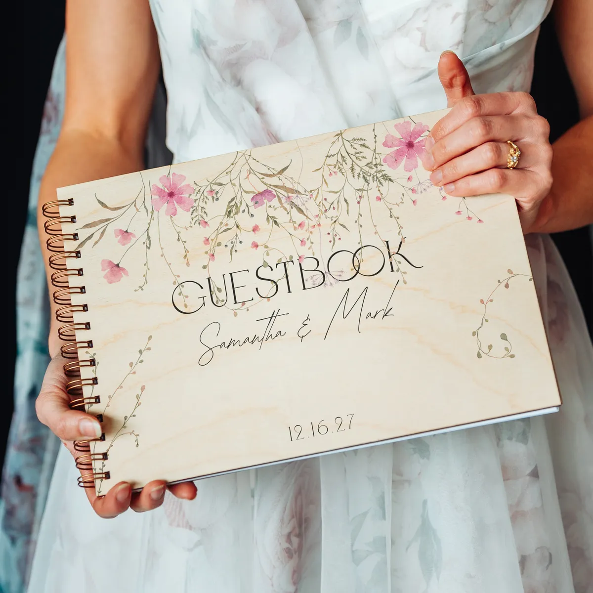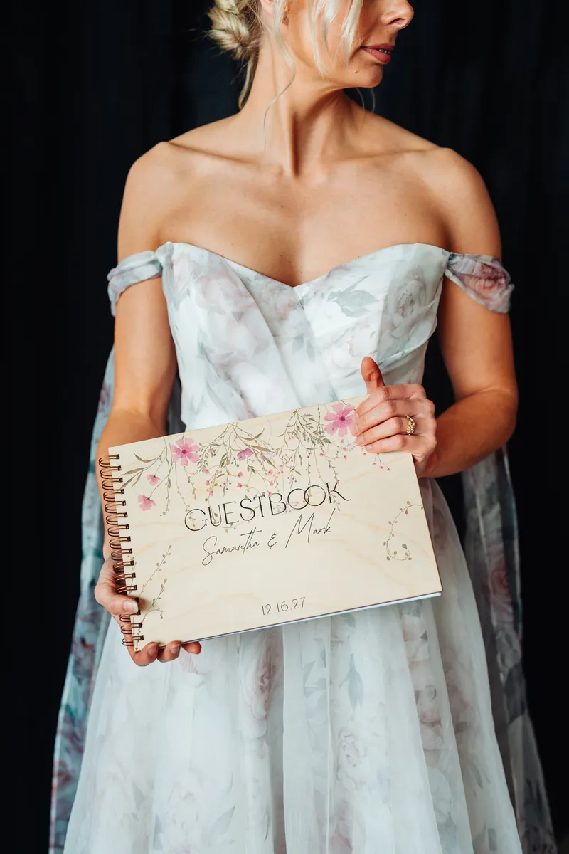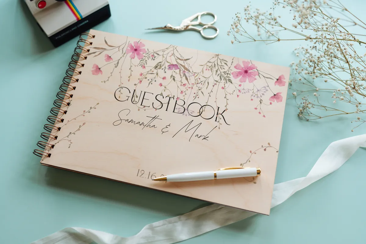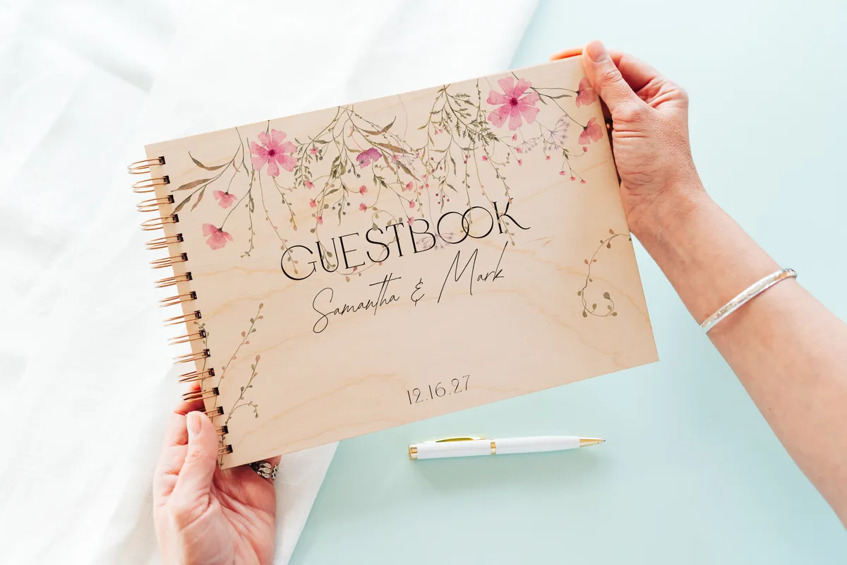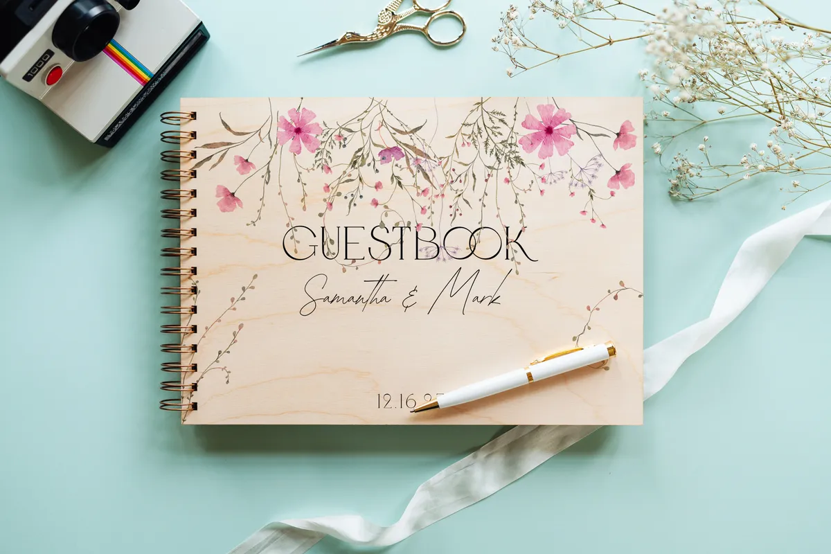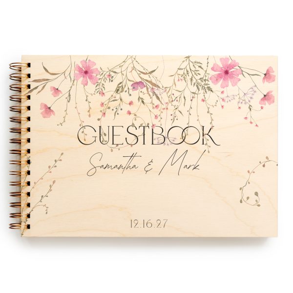 Celebrate your love story with this romantic Wildflower wedding guestbook, beautifully crafted with a natural wooden cover and delicate full-color floral printing. Designed with a soft, organic aesthetic, this guestbook features cascading wildflowers in gentle shades of blush pink, dusty rose, sage green, and muted earthy brownsโcreating a dreamy, nature-inspired look perfect for elegant, rustic, or boho weddings.