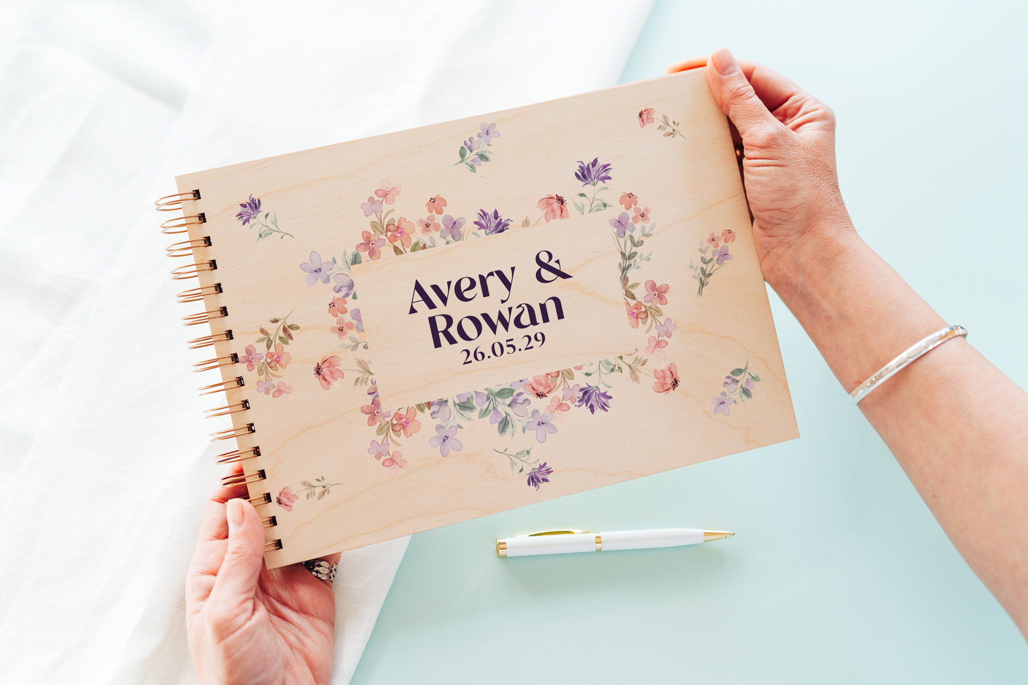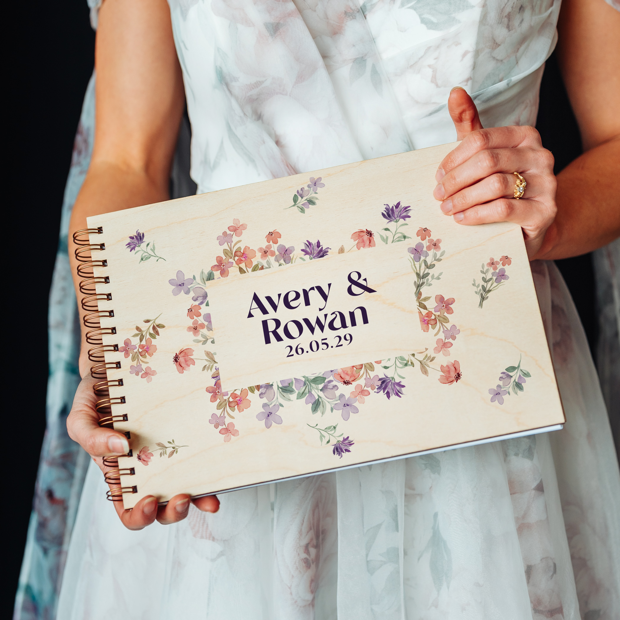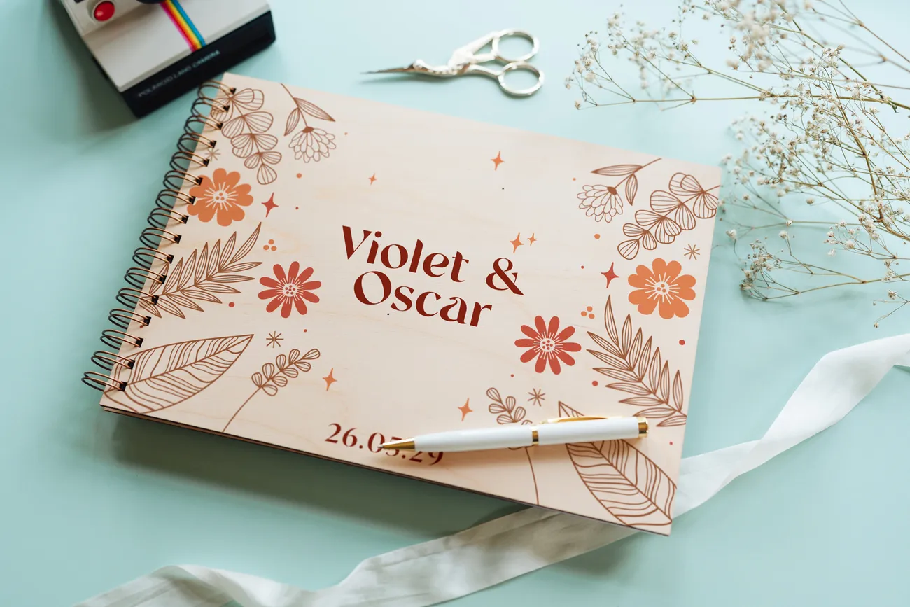 Your names and wedding date are colour-printed directly onto a natural birch wood cover, with waterproof, long-lasting inks that let the beautiful wood grain show softly through โ a warmth no paper or fabric cover can replicate. The result is part keepsake, part centrepiece: stunning on your signing table, and just as beautiful on a coffee table for years to come.