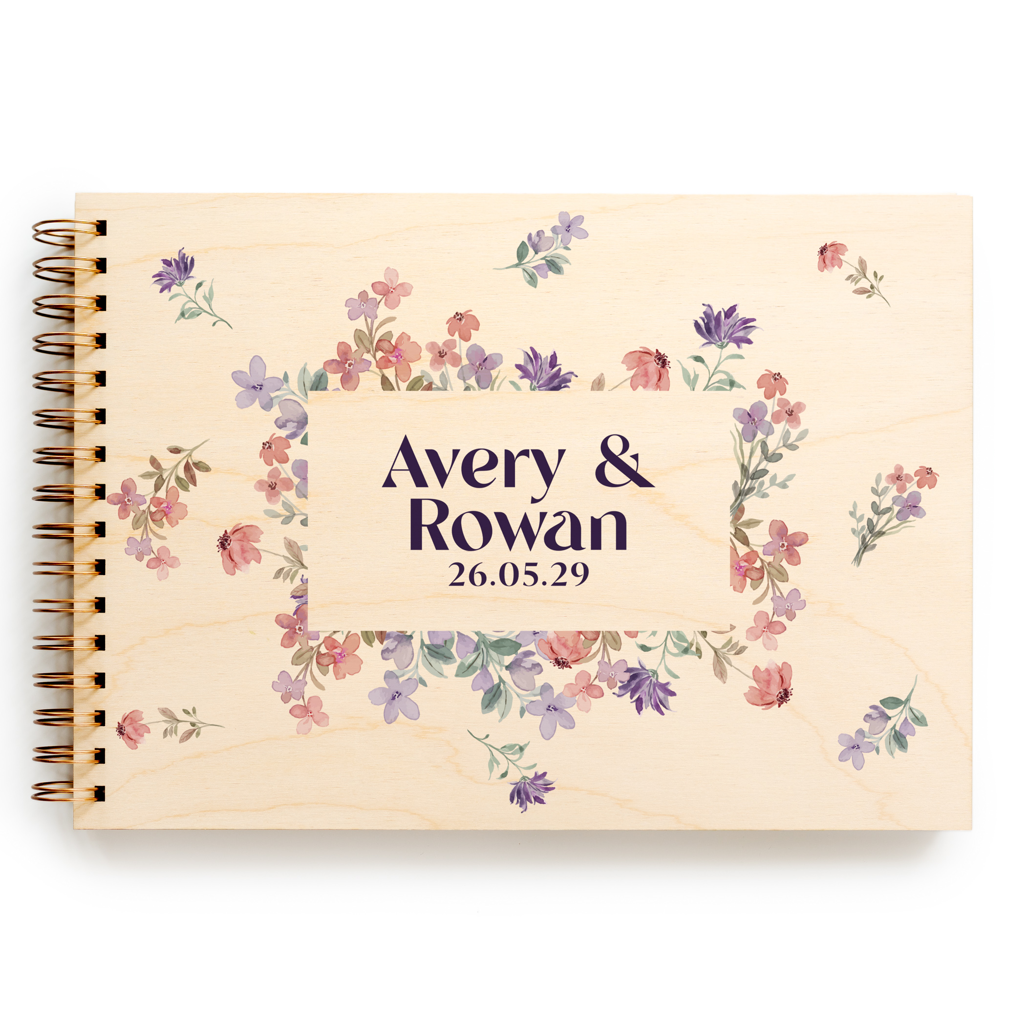 ive your wedding day a touch of garden romance with this beautifully personalised Wildflower Border Wedding Guest Book. What sets this design apart is the full four-sided floral frame โ a lush, dense border of hand-painted style wildflowers in soft lavender, blush pink, coral, and purple that completely surrounds your names and wedding date, like stepping into a blooming cottage garden.