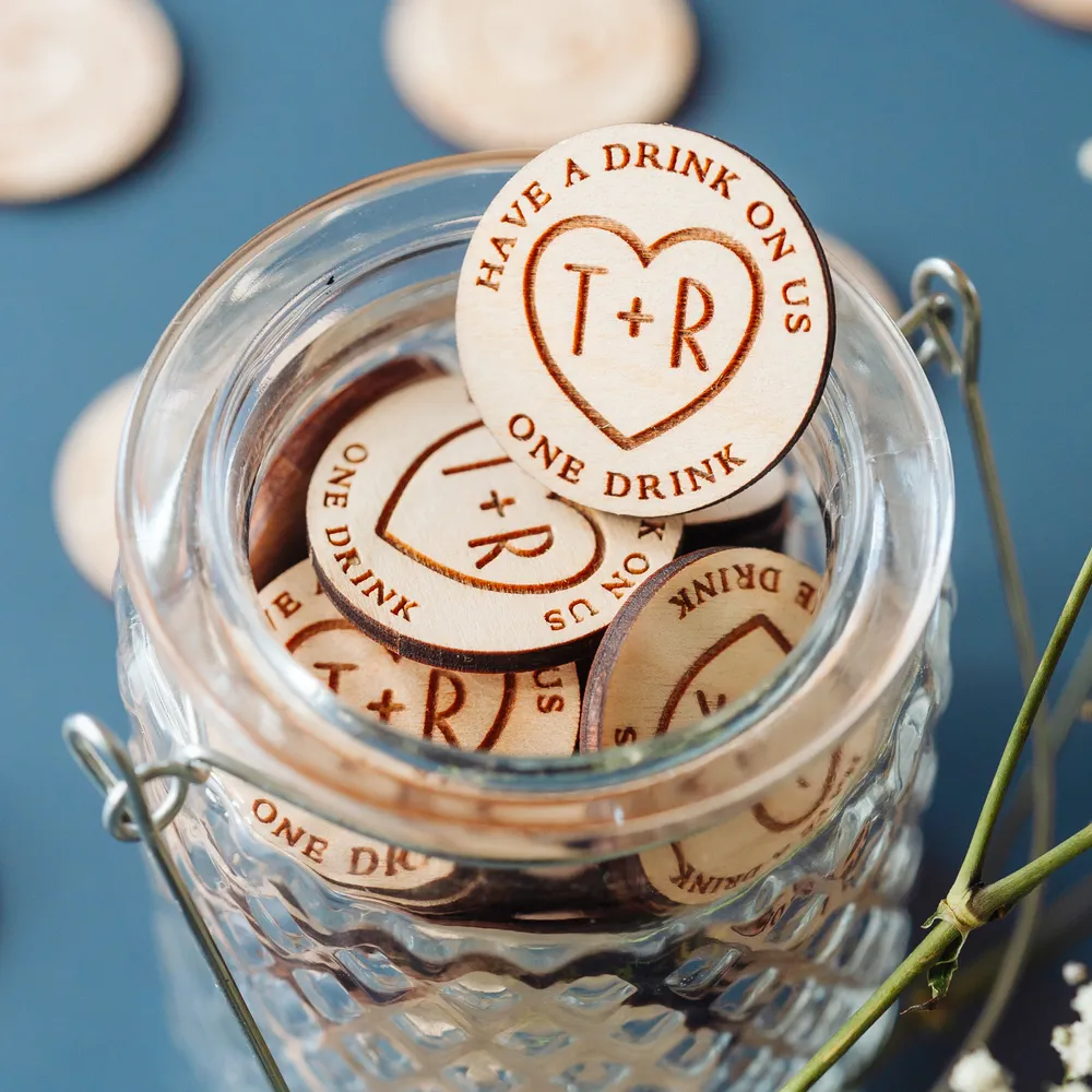 Wedding drink tokens are basically little tickets, tokens or chips – They’re small, printed or in our case, engraved. Couples often personalise to match their wedding theme — Have a rustic barn wedding, pick a rustic token, have a slick Vogue vibe going? Then pick something more contemporary. There’s a design out there for everyone.