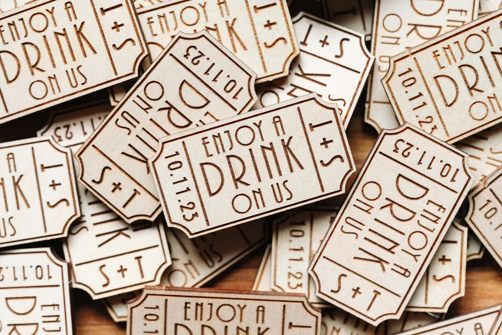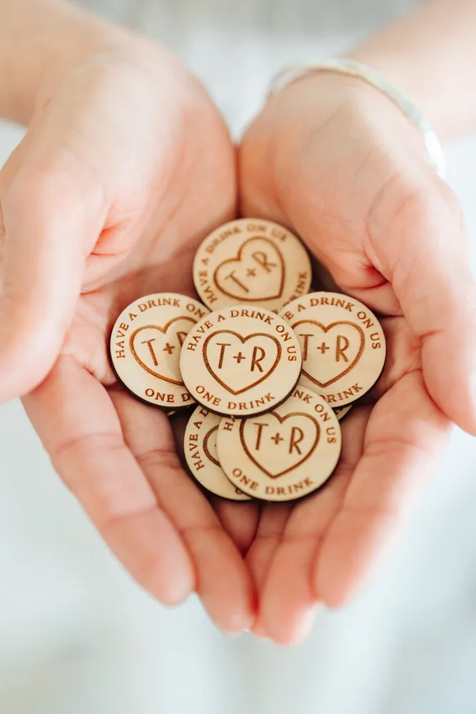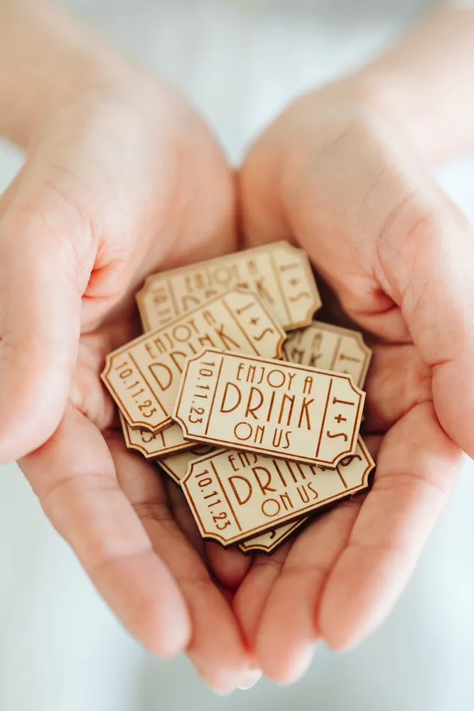 Using personalised wooden wedding drink tokens at your wedding offers a range of advantages, including controlling bar expenses by setting a limit to the number of complimentary drinks.