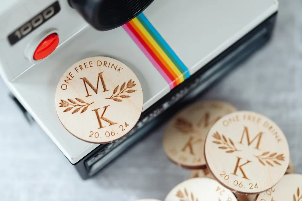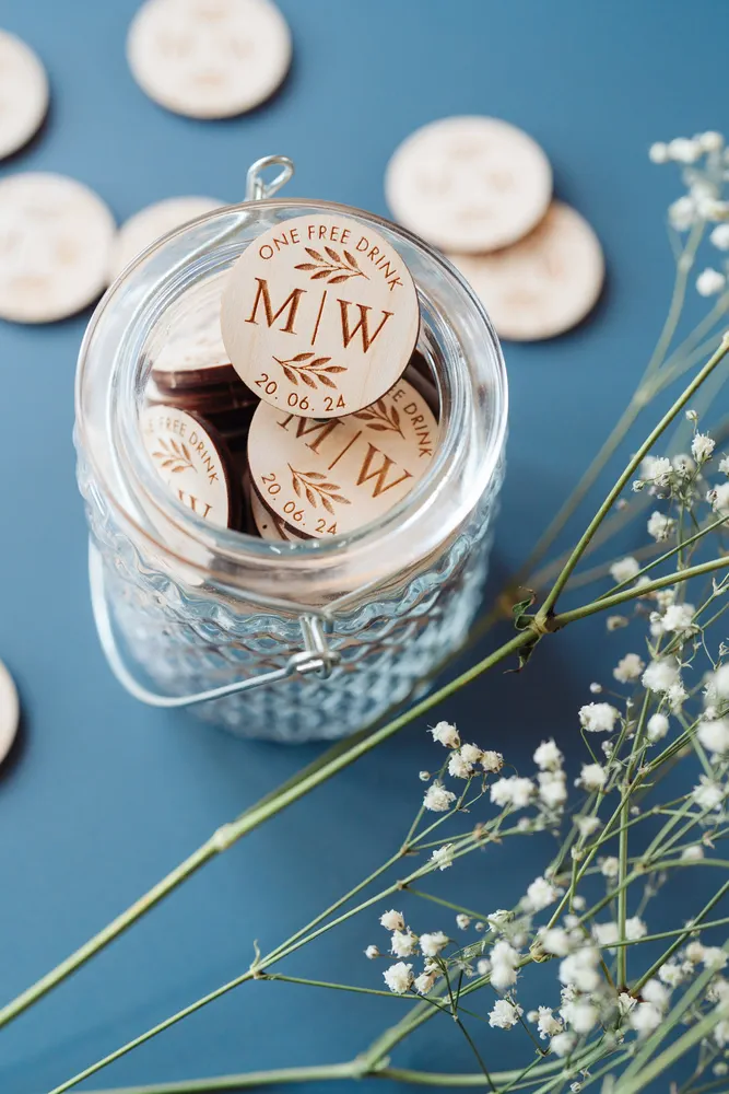 You could include a token in each guest’s place setting or hand them out as guests arrive, making it a personalised welcome. Another option is to have a designated person distribute the wooden wedding drink tokens during the day or the evening. Whichever method you choose, ensure it is organised and efficient, ensuring every guest gets a chance to enjoy a drink on you.